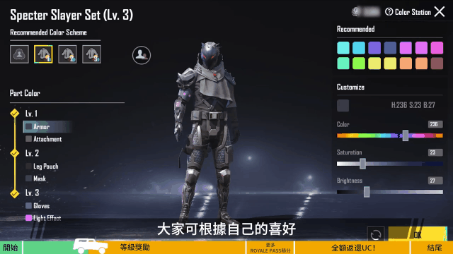 此套装大家可以根据自己的喜好来更换颜色。不过这些颜色需要在升级中获得颜色卡,才能解锁。