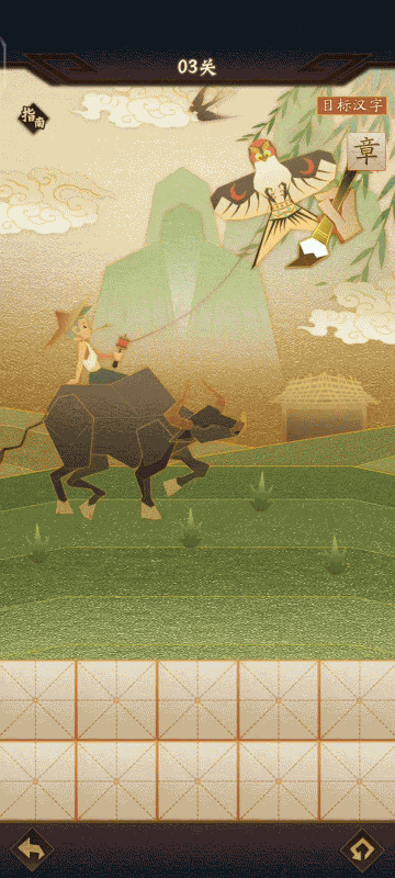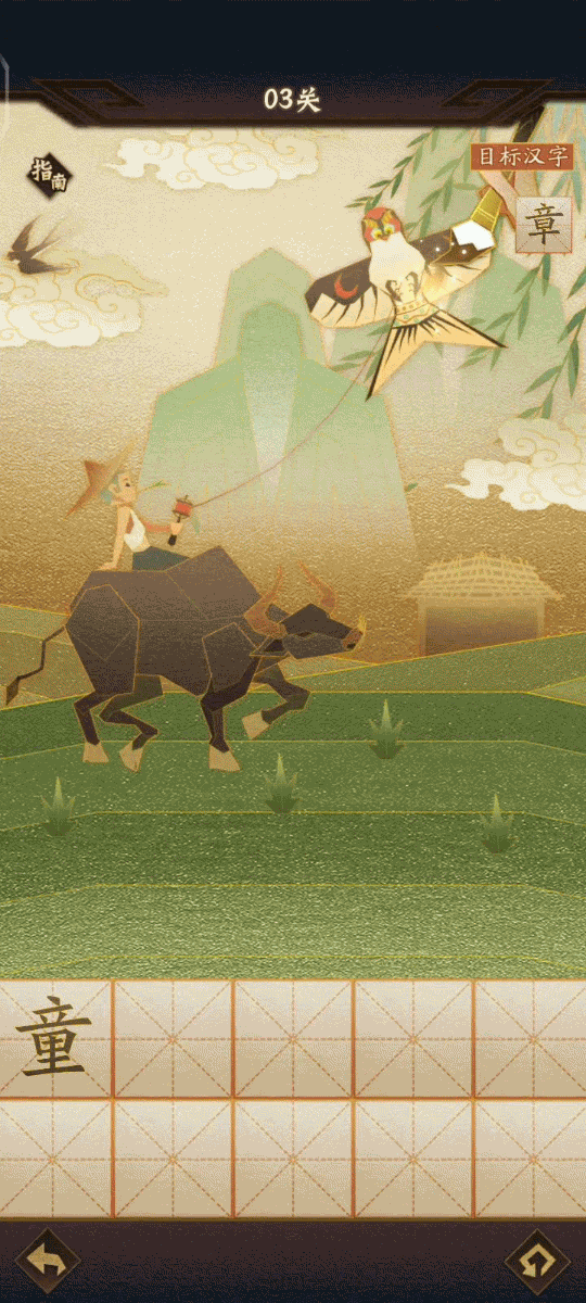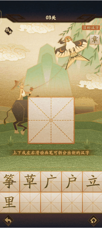 比如关卡的目标字是“章”,就先找出与“章”偏旁部首有关的“童”和“草”(大白话:大笔一挥分别点一下牧童和草地),这样第一步就完成啦!