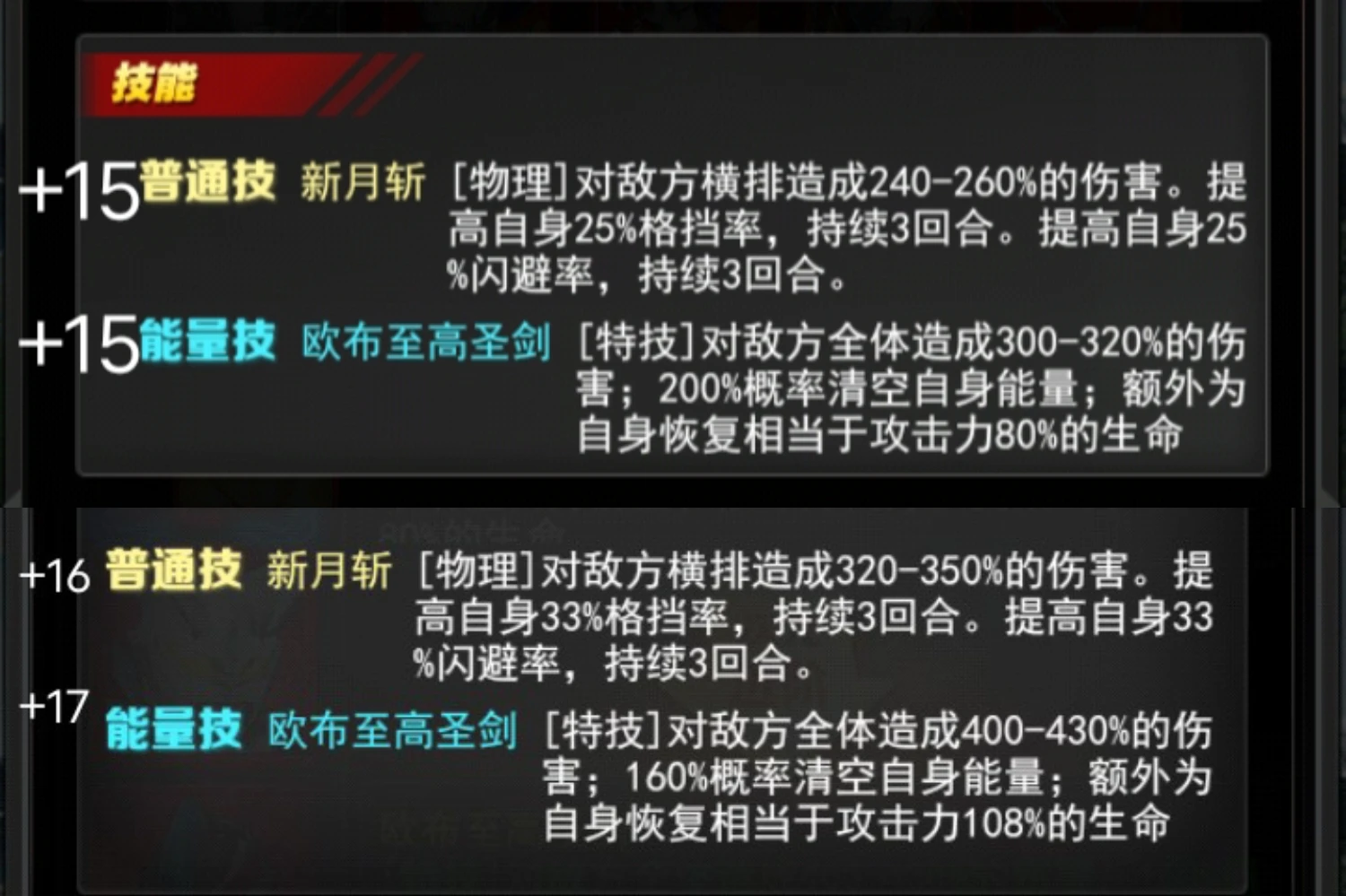 +16普通技 新月斩[物理]对敌方横排造成320-350%的伤害。提高自身33%格挡率,持续3回合。提高自身33%闪避率,持续3回合。
