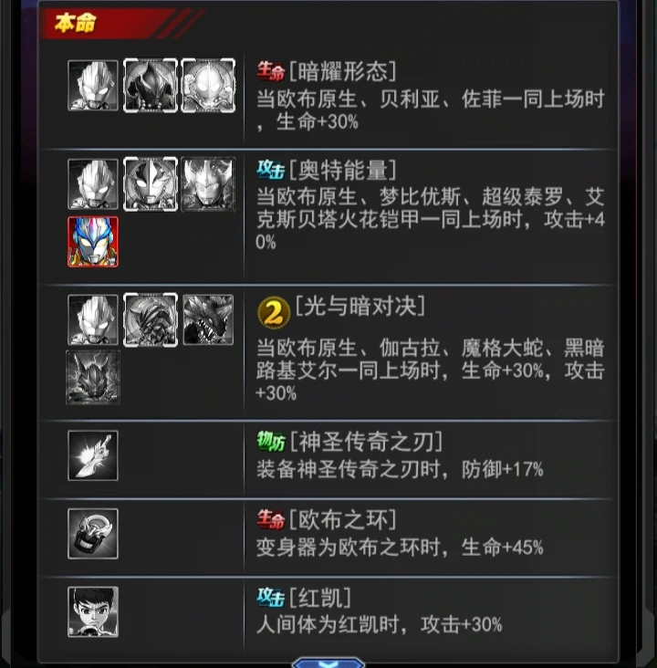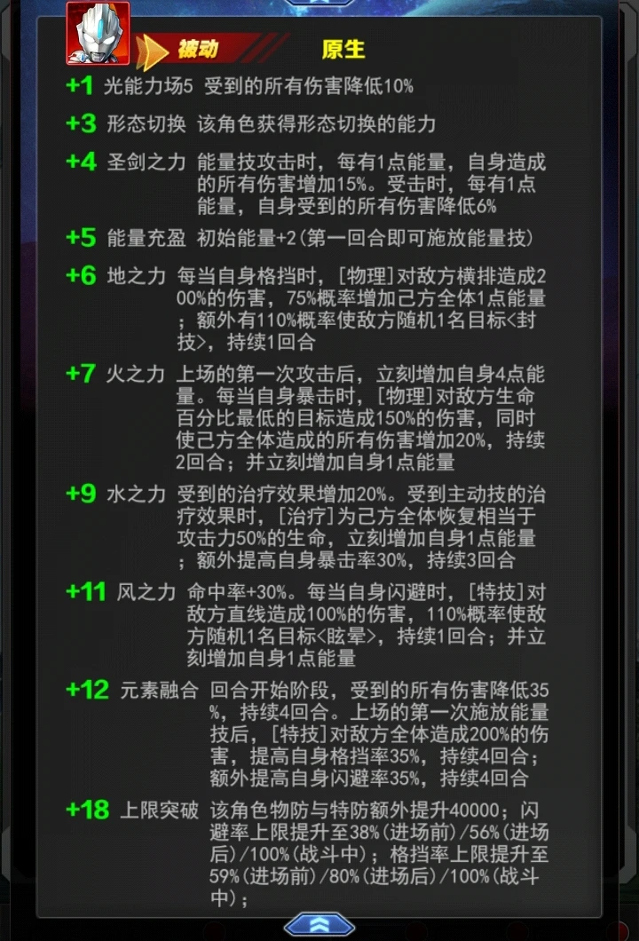 +17能量技 欧布至高圣剑[特技]对敌方全体造成400-430%的伤害;160%概率清空自身能量;额外为自身恢复相当于攻击力108%的生命