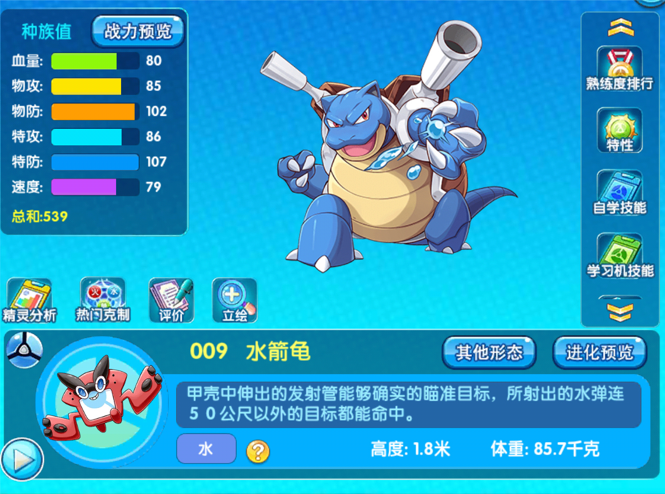 而且防御能力和血量也是相当尴尬,输出方面就更不用说了,他这点输出还不如他的兄弟喷火龙高,所以说新人拿到杰尼龟之后也别进化,也不要动,直接扔仓库等后面加强再拿出来。