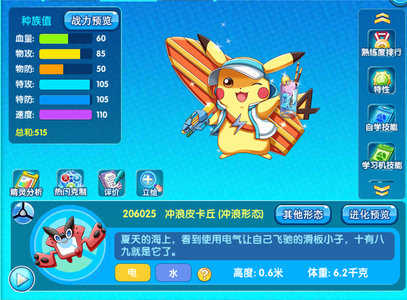 另外一个就是这个冲浪皮卡丘了,我之所以把这个宠物也归类为炮灰类型,主要就是因为他们皮卡丘家族,他算是比较差的一类,这个皮卡丘,我记得应该是四年前周年庆给的,那个时候策划还没有像现在那么的放飞自我,那个时候设计吉祥物宠物给的特性和种族值分配都是相当之拉跨