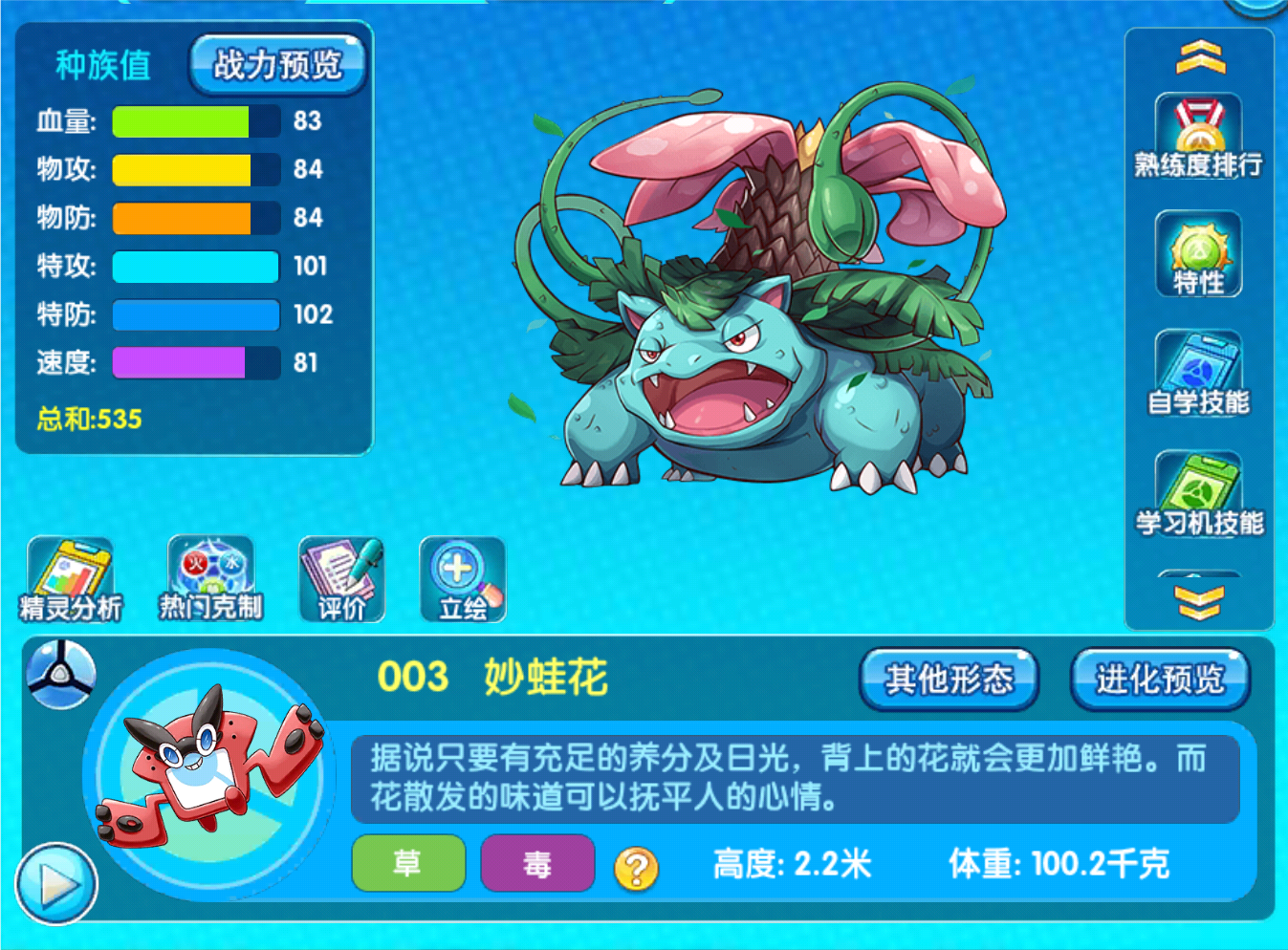 说完了,妙蛙花下面要说的就是这个老班了,老班说实话,他这个形态的定位可以说是相当的模糊,如果让他打输出的话,说实话,前期优势并不大,如果让他当做一个盾,那还行,再加上本身的天气效果可以多增加1.5规的特防,但本身种族值的分配又接近于输出,所以显得很模糊。