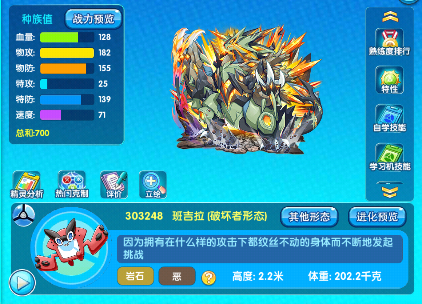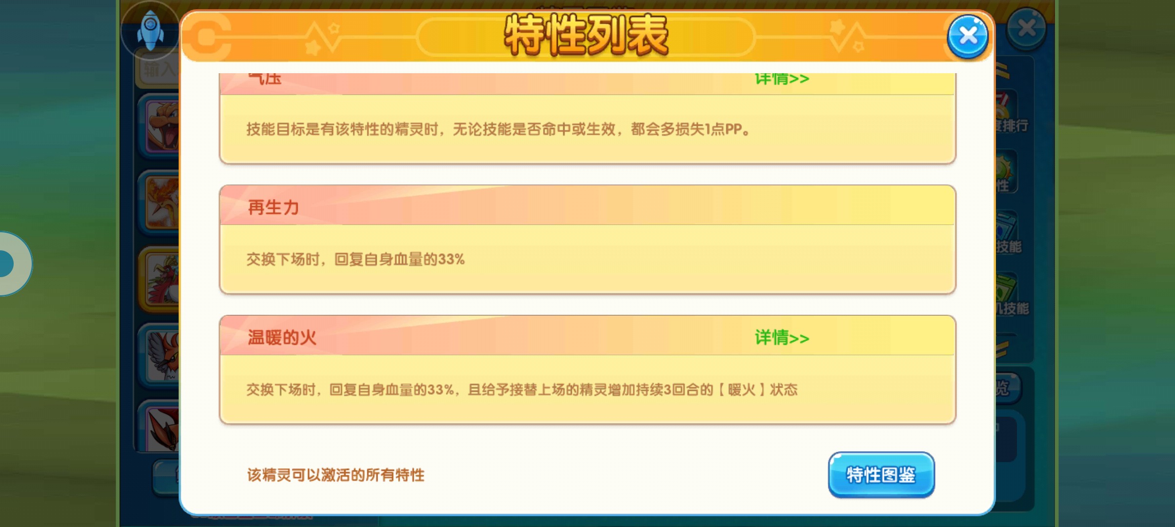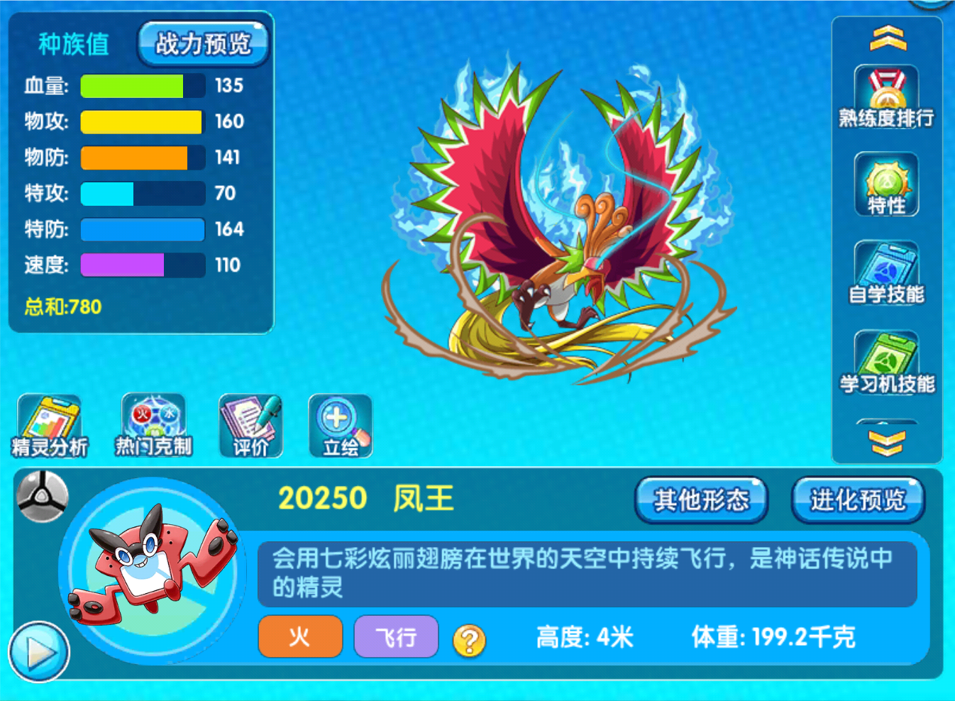 那么,作为新人入坑签到宠物第七天的最终大奖,我们的凤王它的强度就要比前面几个要高出太多了,这个精灵最近两个月才刚刚优化加强,虽然普通的没有给闪光的专属特性,但是给了一个辅助特性,这个特性可以让队友上场的时候获得一定的回血效果,可以说是相当的不错,再加上本身的种族值也进行了优化,更加的抗揍了。