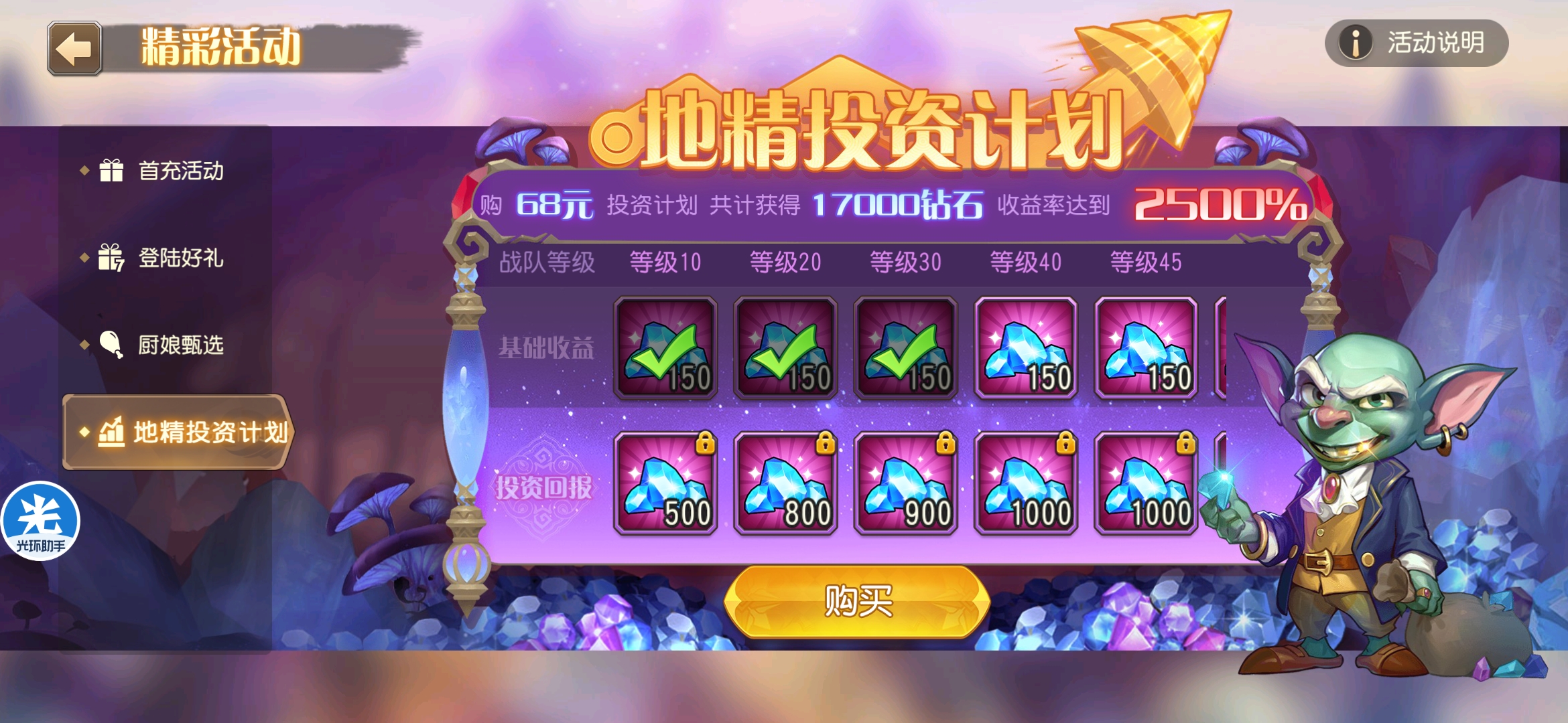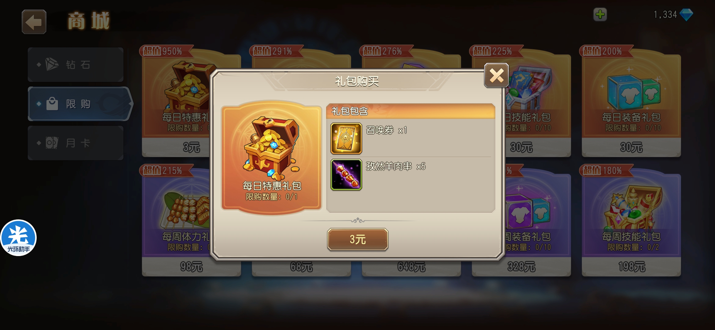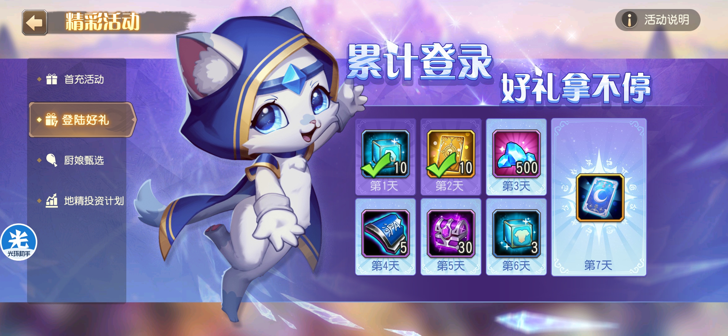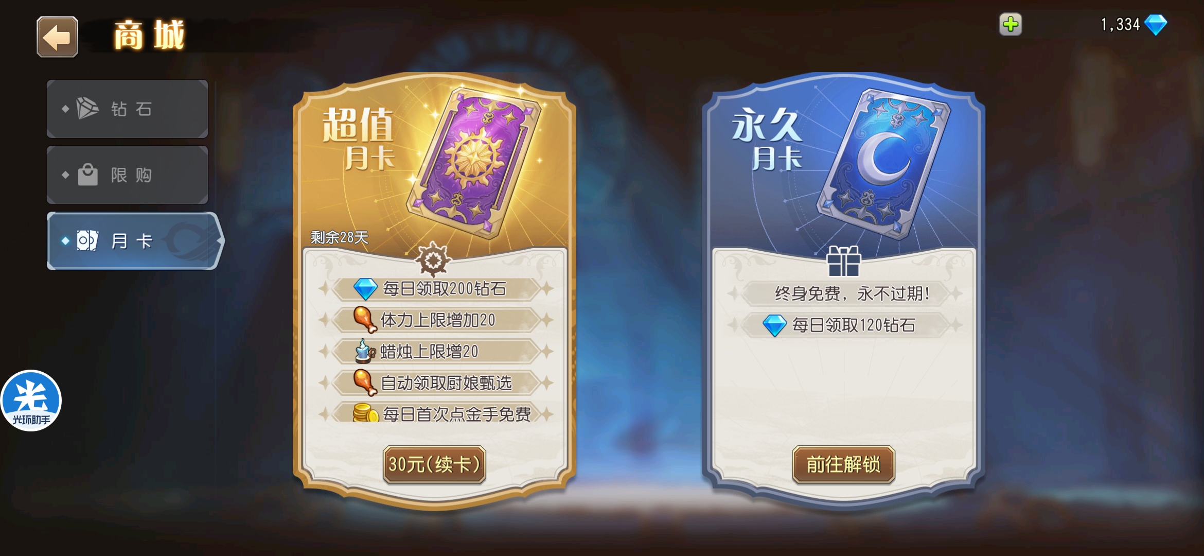 目前的这些礼包貌似就月卡划算点,所以我只充了个月卡。 月卡每天有200钻石体力上限还能增加,那个蜡烛是打35级试炼塔的,还能自动领取每日两次的120体力防止领不到