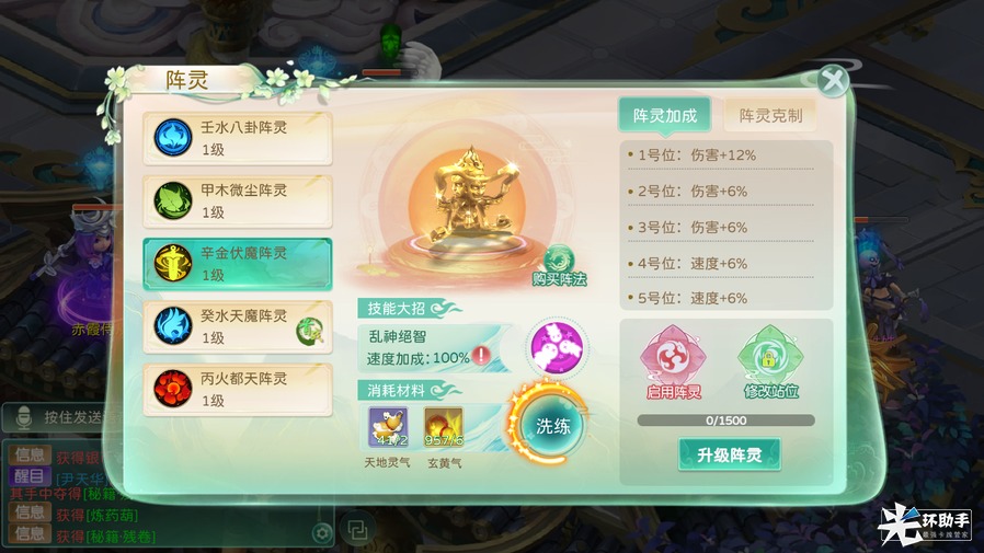 阵灵也是阵法中重要的一个部分哦。每个阵法的阵灵同样可以给队伍带来属性加成,如果对当前阵法的属性或者阵灵不敢兴趣,还可以通过洗练来变换阵法的阵灵跟属性。其中阵灵主动技能也是可以给队伍带来一定的战斗优势,每个阵灵的主动技能都不一样。