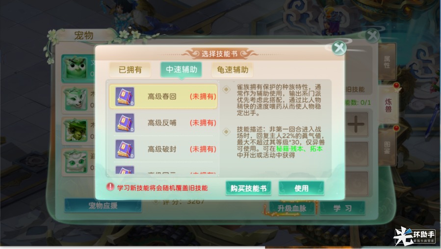 2、宠物可以通过使用技能书学习新技能,学习过程中会随机顶替已学习的技能。