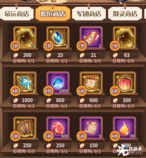 职位商店根据自身的职位等级开启新道具,女神泪和神陨是最值得购买的!其他道具选择购买!