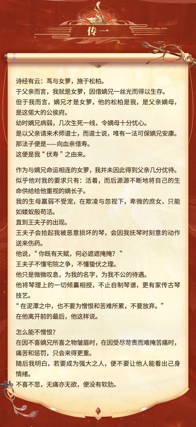 伏寿幼年时因庶女身份饱受欺凌与忽视,哪怕是自己的名字也因道士言明要保嫡子长寿须借血亲之寿才得“伏寿”之名,所以在明白事理后她便极其厌恶这个名字。