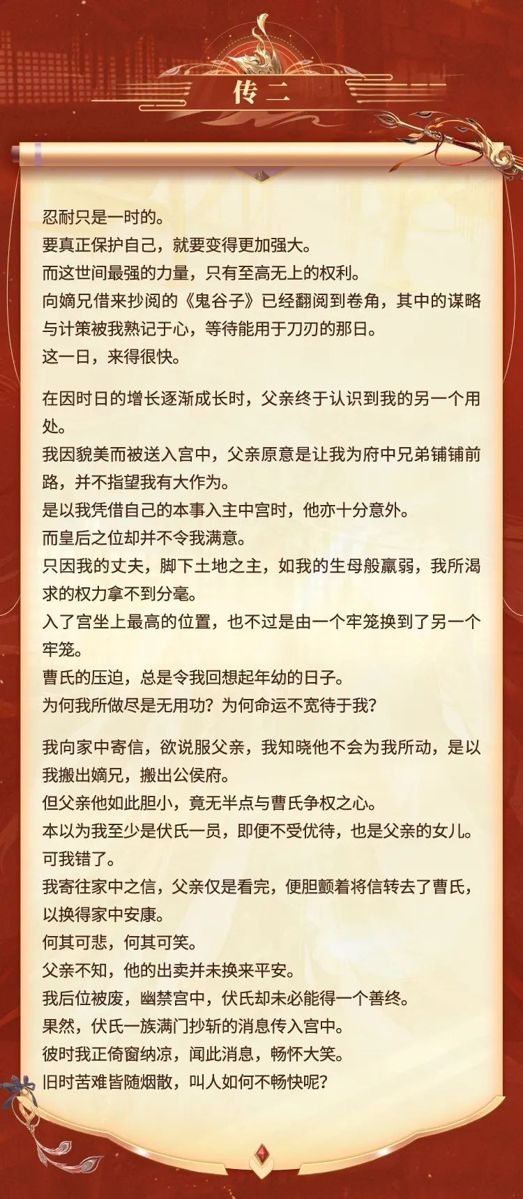 她逐渐学会了收敛情绪与伪装,只有让自己变得强大才能保护自己,终于她等到了入宫为后的机会,然后汉献帝的羸弱与曹氏的压迫让她本以为能够实现的理想与抱负全部覆灭,计划铲除曹氏却又被亲人出卖,失败的她被囚禁于深宫之中,郁郁寡欢的她逐渐走向死亡。