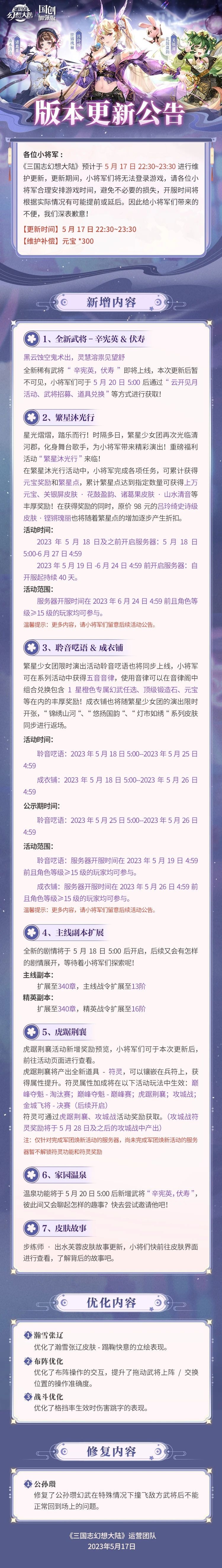 更新公告|“繁星沐光行”活动携皮肤5月18日上线!光环-小Y发布于 2023-05-17关注各位小将军:《三国志幻想大陆》预计于5月17日22:30-23:30进行维护更新,更新期间,小将军们将无法登录游戏,请各位小将军合理安排 游戏时间,避免不必要的损失,开服时间将根据实际情况有可能提前或延后。因此给小将军们带来的不便,我们深表歉意!【更新时间】5月17日22:30-23:30【维护补偿】元宝*300