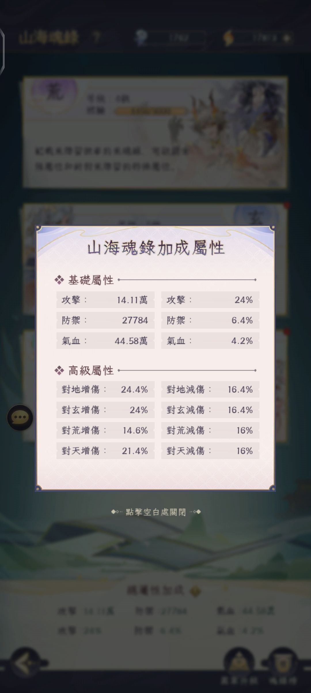 3.【山海魂录】中的“总属性加成”是不限制玩法的全体属性加成,“阵营加成”(对天/地/玄/荒的加减伤)仅限于[剑冢深境]玩法内(也加战力,但这也就是所谓的“虚战”)。这里追求战力的就优先点高属性和百分比加成的。追求属性的建议全力升级攻击属性,其次百分比血防,之后再点防御血量,最后阵营加成。