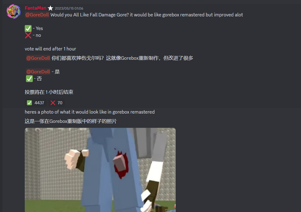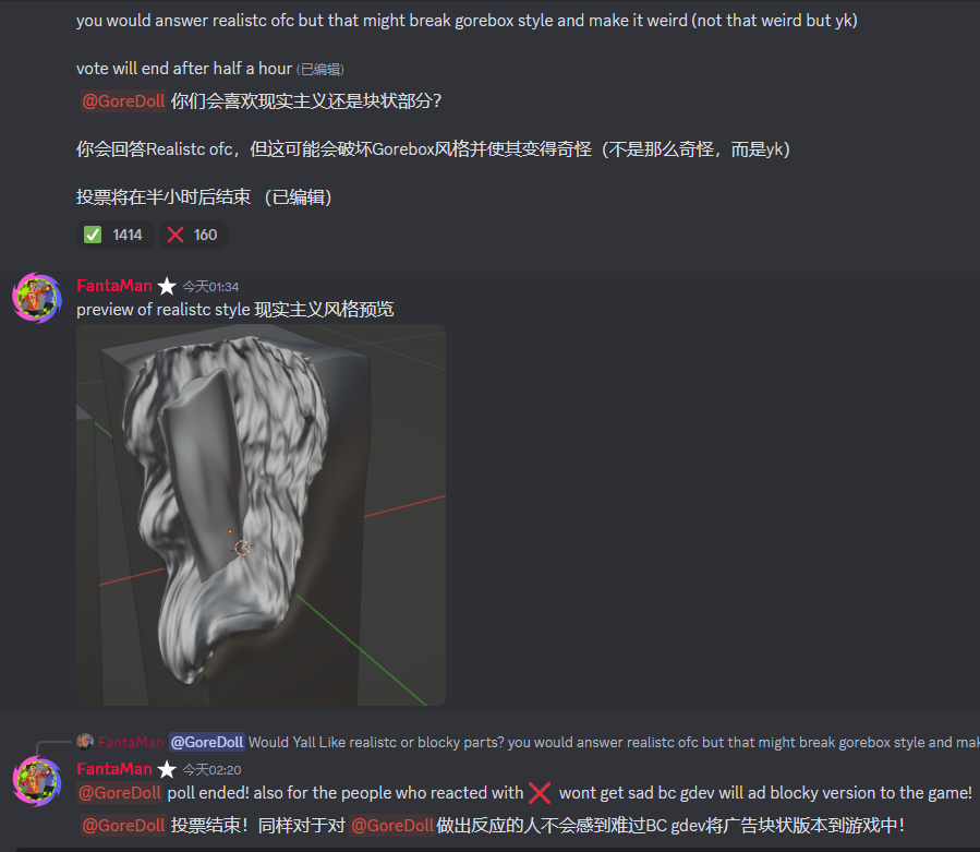 随后5月17日FantaMan又发起了一项投票,问:玩家们 你是喜欢写实状态还是方块状态✔or❌