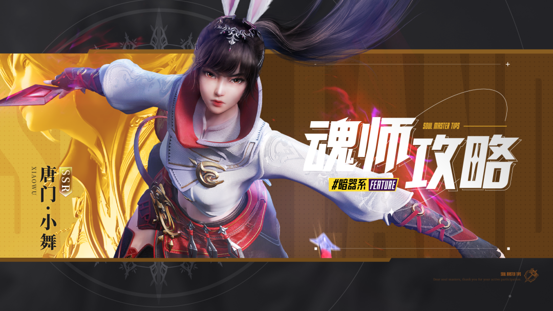 唐门·小舞是一位专长于自身回合内使用暗器的暗器型魂师,其能够在同一回合内多次追击使用不同的暗器,直至弹药为空且仅能释放入门暗器时为止。