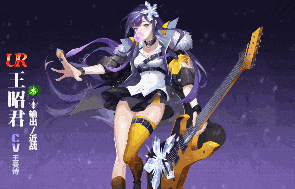 武神觉醒中的王昭君以美少女吉他手的形象出现,身着短裙套装,长短不齐的袜饰尽显作为吉他手的个性和张扬。昭君的如瀑长发之间,还别有一枚晶莹剔透的雪花发卡,与其技能之间的冰雪元素遥相呼应。她所持的武器为一把电音吉他,通体橙黄的吉他上点缀着一枚更为显眼的冰雪雕饰,散发出的光辉如少女的青春般闪耀。王昭君一手持吉他、一手把弄着拨片,举手投足间是独属于少女的满满元气。