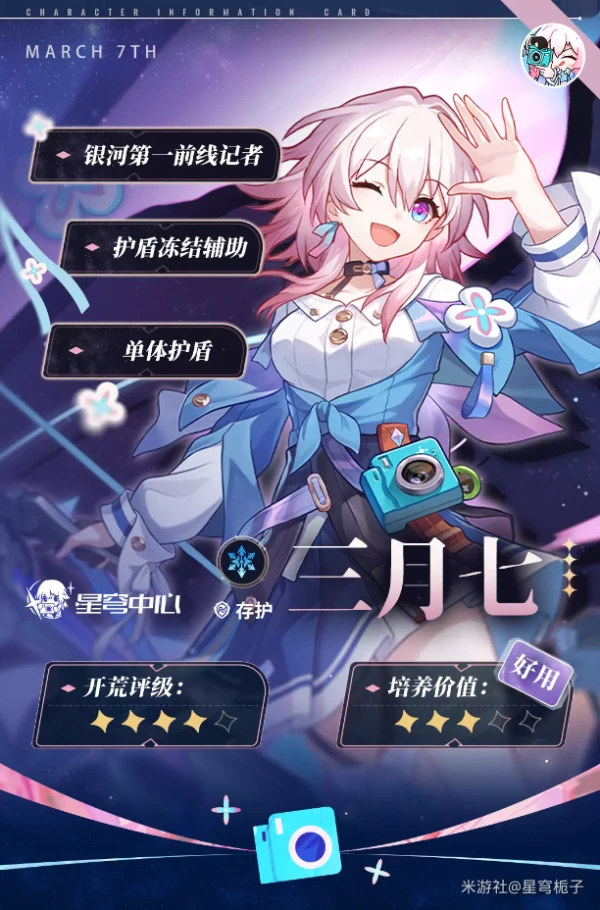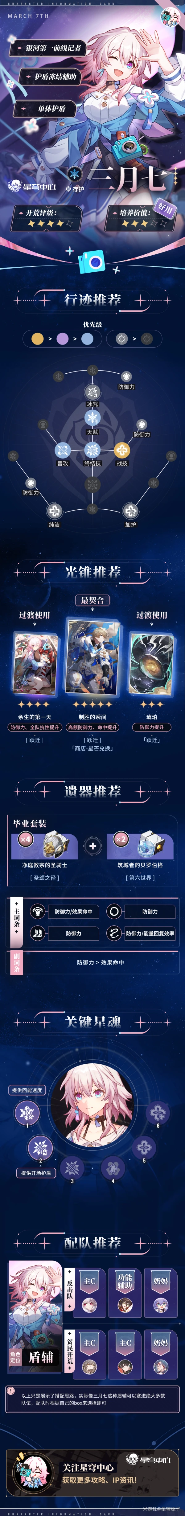 总的来说,三月七是一个综合素质尚可的生存辅助,要护盾有护盾,要控制有控制,还能解除负面状态,在游戏前期护盾角色数量较少的情况下,是可以考虑养一养的。不过呢,三月七的各个方面都不算特别突出。护盾局限太大,容易保歪,冻结效果触发也不稳定,很多时候并不能达到我们的预期效果,所以对多数玩家而言,目前并不建议过于深入培养。