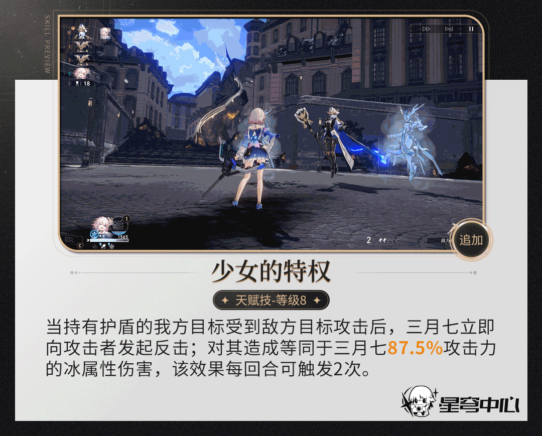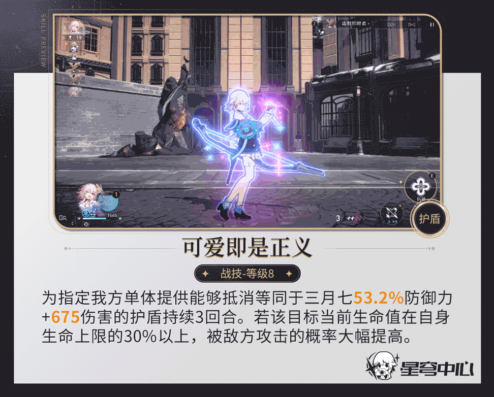三月七为我方队友施加战技后,若该队友的生命值超过30%,则提高其受击概率。这个“受击概率提高”效果的持续时间和护盾的持续时间挂钩。三月七提供的护盾存在时,该“受击概率提高”效果将一直存在,护盾被击破或者到达持续时间时,该效果移除。