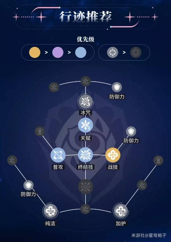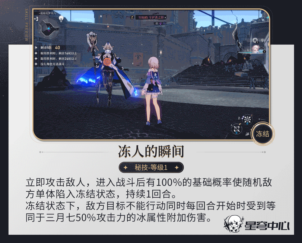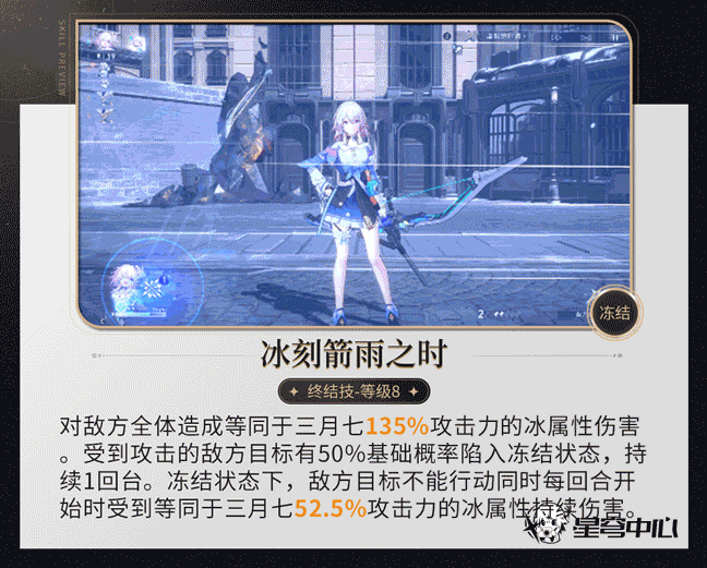 这个技能的倍率不高,而且三月七不会主堆攻击力属性,所以伤害收益很低。它最大作用还是在冻结控制上。冻结敌人后可以延迟敌人的爆发时间,以便我方针对敌人攻击顺序进行战技点分配或者提前收割敌人。不过该冻结只有50%的基础概率,触发非常不稳定,所以实战效果并不是特别好。