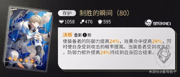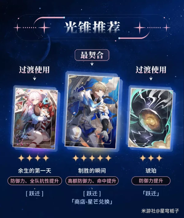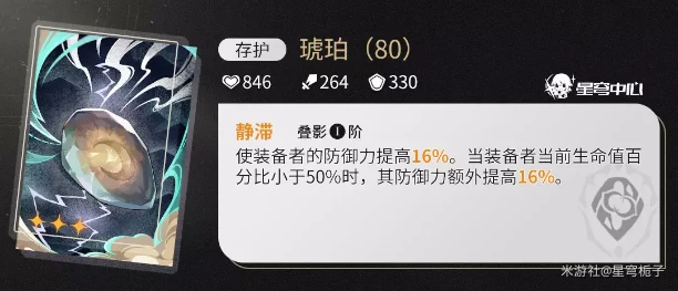 “琥珀”是一个三星的光锥,它也是提高角色防御力的,而且叠影5阶的防御力的提高数值甚至超过上面所说的叠影1阶的“余生的第一天”。不过它的防御力白值还是低了点,所以角色满血状态下表现还是不如“余生的第一天”。因此推荐大家过渡使用。