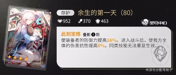 “余生的第一天”能够提高角色的防御力,并且在战斗时还会提高全队的抗性,两个效果均能增强队友的生存能力,和三月七的契合度较高,是四星的毕业光锥。