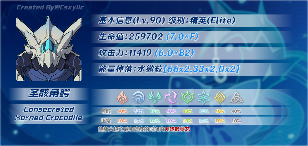 ●特征抗性:40%全抗性,70%水元素抗性。,瘫痪或失去噬骸能量时全抗性降为10%。