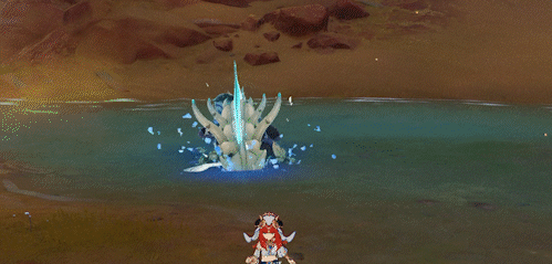 圣骸角鳄施放该技能时会留下「噬骸能量块·水」,其可被1次水元素攻击、6次其他元素攻击击破,物理攻击无效,其仅存在6s,可被芭芭拉和妮露的水环、莫娜遁地的冲刺击破,圣骸角鳄在超时后吸收「噬骸能量块·水」,且立即施放「鳄鱼划水」技能重新强化自身抗性提升。