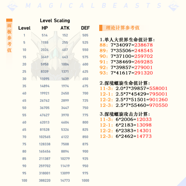 该表计算了可能遇到的等级的圣骸角鳄的数据,包括深境螺旋。
