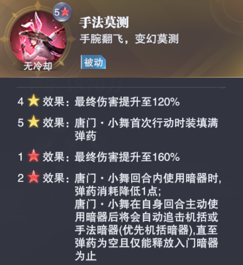 暗器小舞到手是黄色3星,其质变星级为红色2星和红色5星,其中没到红色2星前就基本上是很难用的状态,因为无法激活连续使用暗器的效果,所以这个成本大家可以注意