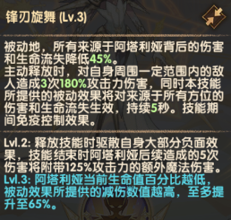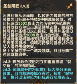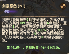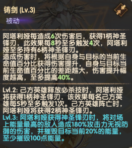 阿塔利娅每获得5柄神圣锋刃,将永久提升己方英雄造成的伤害和若干点破防。己方英雄受到控制效果时,将对控制效果来源造成伤害并且使目标在后续一段时间内无法回复能量。