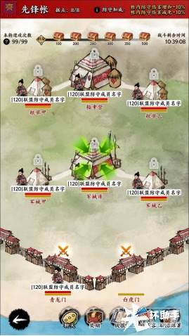 5)点击任意营帐进入其内部,每个营帐内部由若干个建筑组成分为城门、辎重与据点。