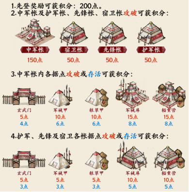 4)总积分包括攻破据点积分、攻破军帐积分、先登积分,以及结算日各个存活据点的存活积分。