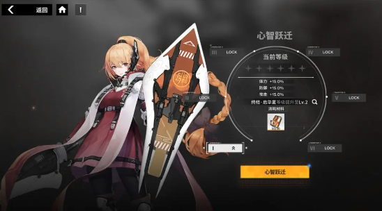 心智跃迁便是将重复角色转化的碎片用以对角色的培养,SR、R每个角色设立了四个等级的心智跃迁,SSR为六个,只能依次解锁。