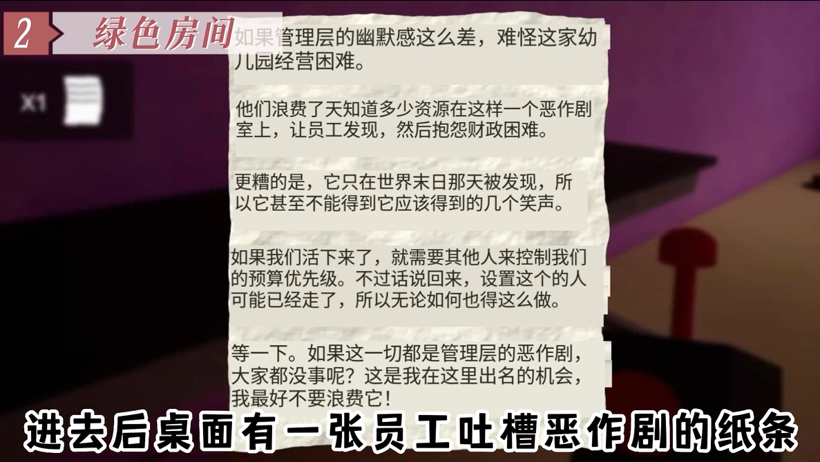 接着是绿色房间,进去后桌面有一张员工吐槽恶作剧的纸条。