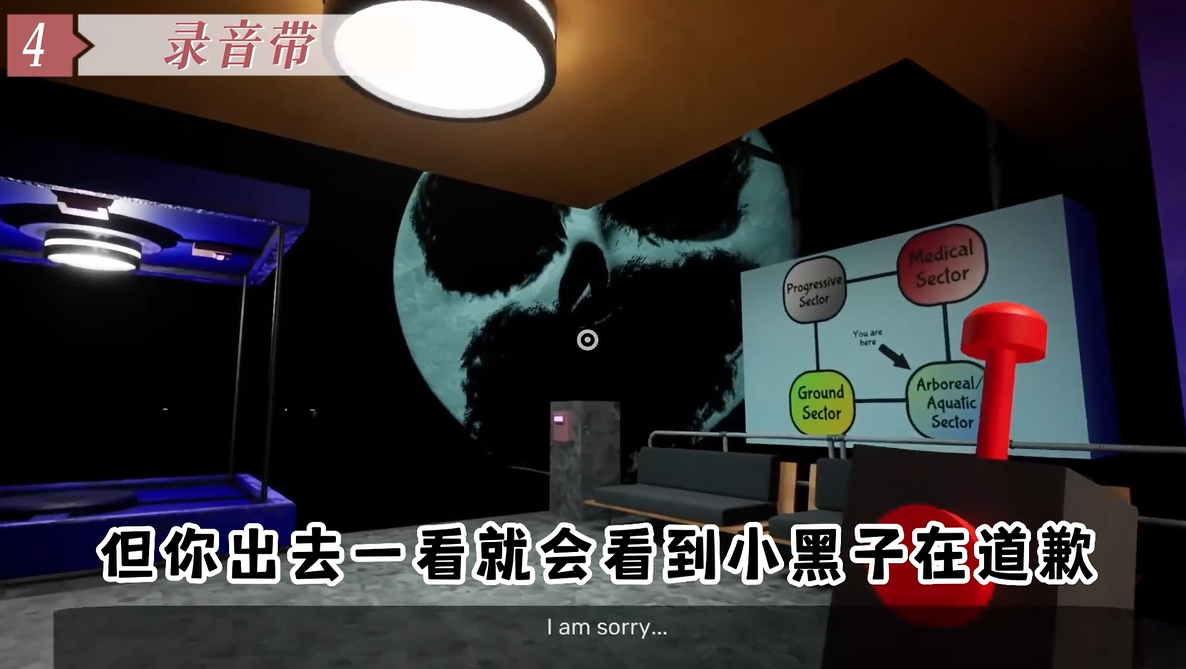 而门里边放着是一段录音和一张纸条,上面写的是有一个怪物太大太危险,不知道应该怎么安置?