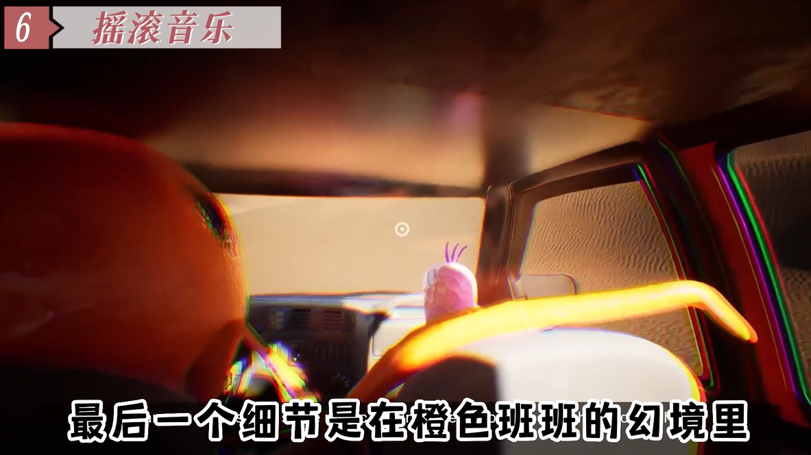 最后一个细节是在橙色斑斑的幻境里,我们可以听见他车里放的歌。