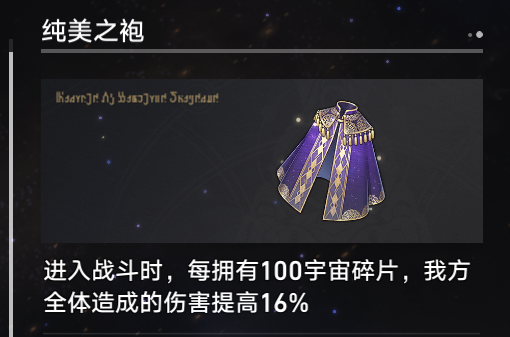 【纯美之袍】:是属性最为特殊的道具。注意看属性介绍,每100宇宙碎片可以提高全体伤害16%。碎片越多伤害越高。300碎片就可以提升48%的伤害, 碎片越多伤害越高。也就是说获得该奇物,尽量别消耗碎片。