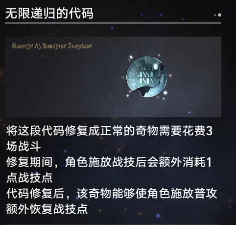 这个也很强,到达第五关的时候有几率碰到,从而可以获得从中选择奇物进行修复。这个奇物是【无限归递的代码】,只要战斗三回合就可以获得永久效果。释放普攻时可额外获得一个战技点,相当于减少一个回合次数。根本就可以不用担心战技点事情,技能随便使用。