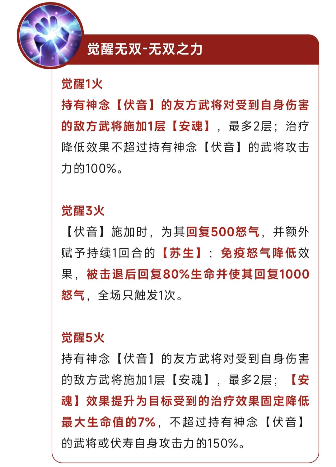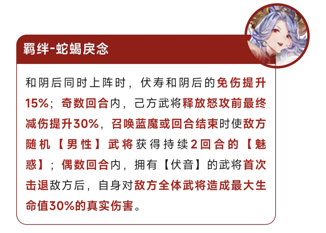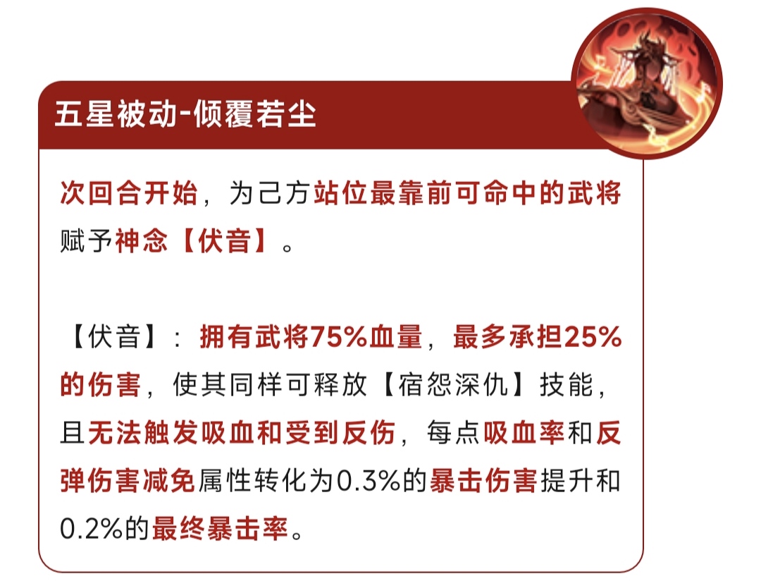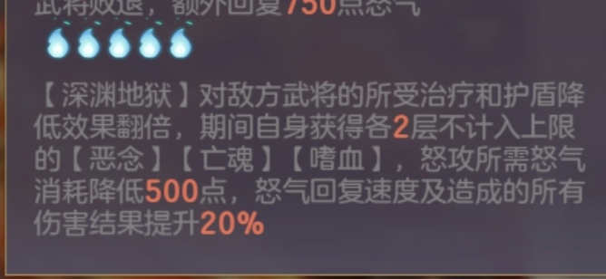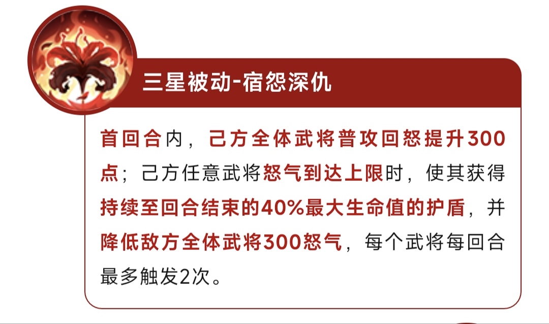 奇数回合内,己方全体武将释放怒攻前最终减伤提升30%,对于全体武将的坦度有不错的提升。