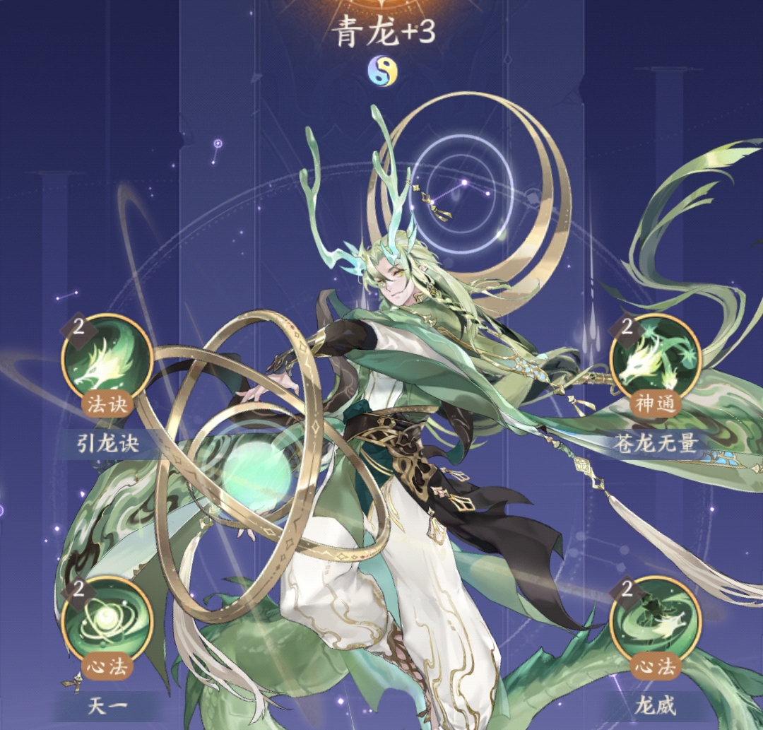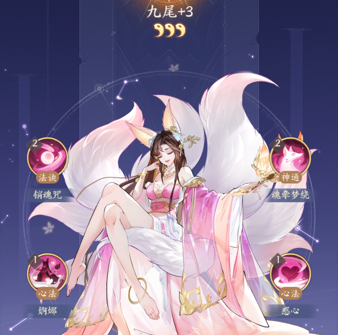 分析:九尾(地)阵营目前唯一的天命c,虽然伤害被削弱了,但是仍然在三核c位中热度最高的一个妖灵,能打能控,其法决和神通都有可观的群体伤害,并且也是优先针对输出位,同时还附带强大的控制效果(神通封印)可以有几率使敌人无法释放神通。作为c位打输出还是副c打控制,都是不二的首选,青龙玩家会用来搭配充当副c和控制效果,并且也能激活九尾的天命缘分。