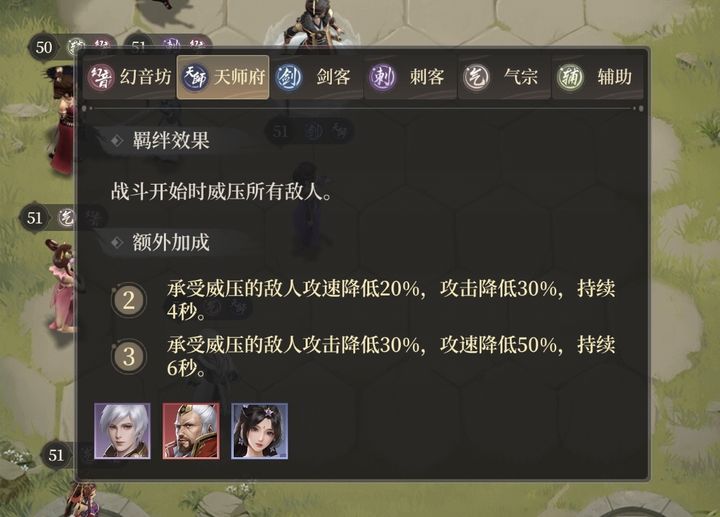 3天师羁绊可以提供大额的减益BUFF,为5幻音及4气宗羁绊的加成提供了足够的叠加时间。变相的增加了己方的输出强度