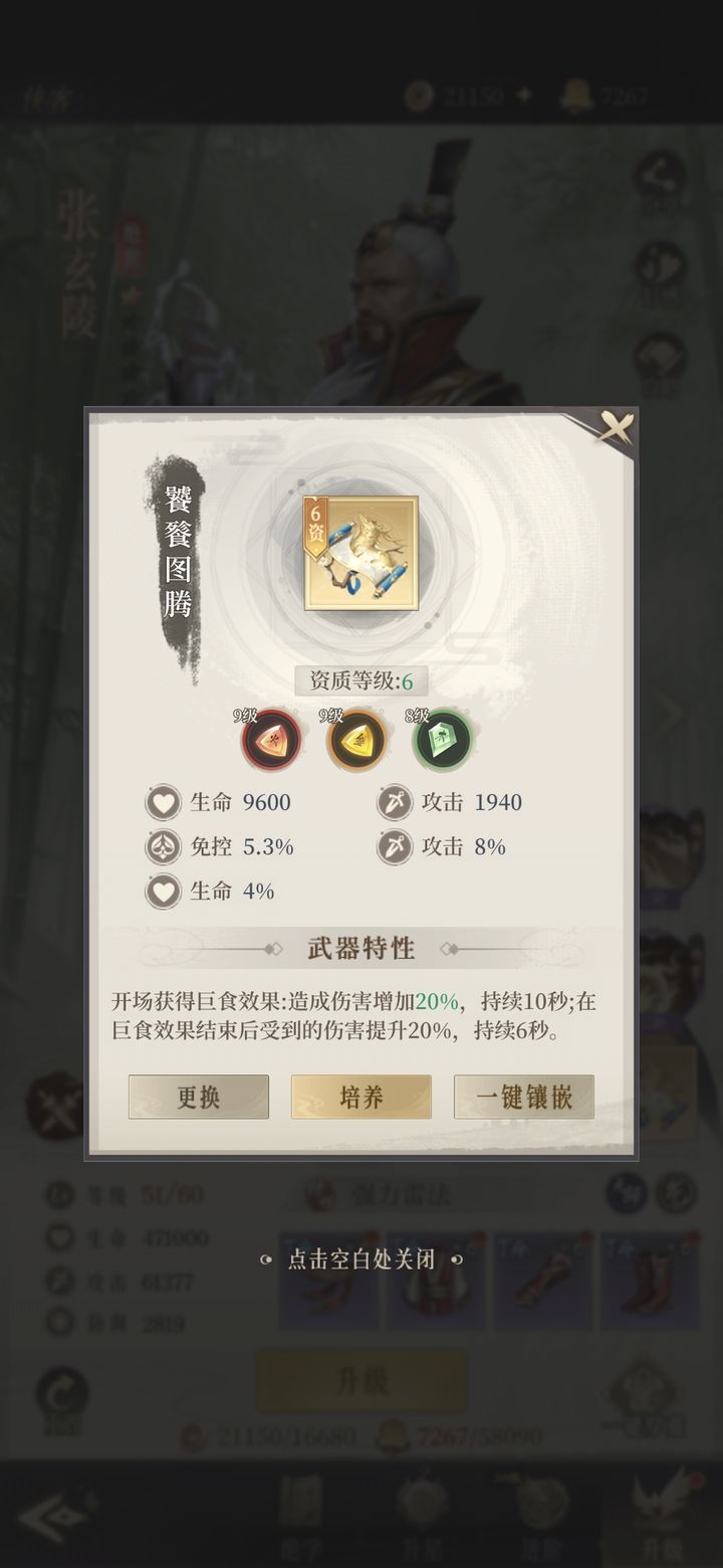 张玄陵的目的就是在最短的时间里打出最大量的输出,然后为女帝的残血收割提供条件。而巨食效果持续10秒,一场战斗一共也就在10秒左右所以饕餮图腾带来的6秒受伤提升可以忽略不计。