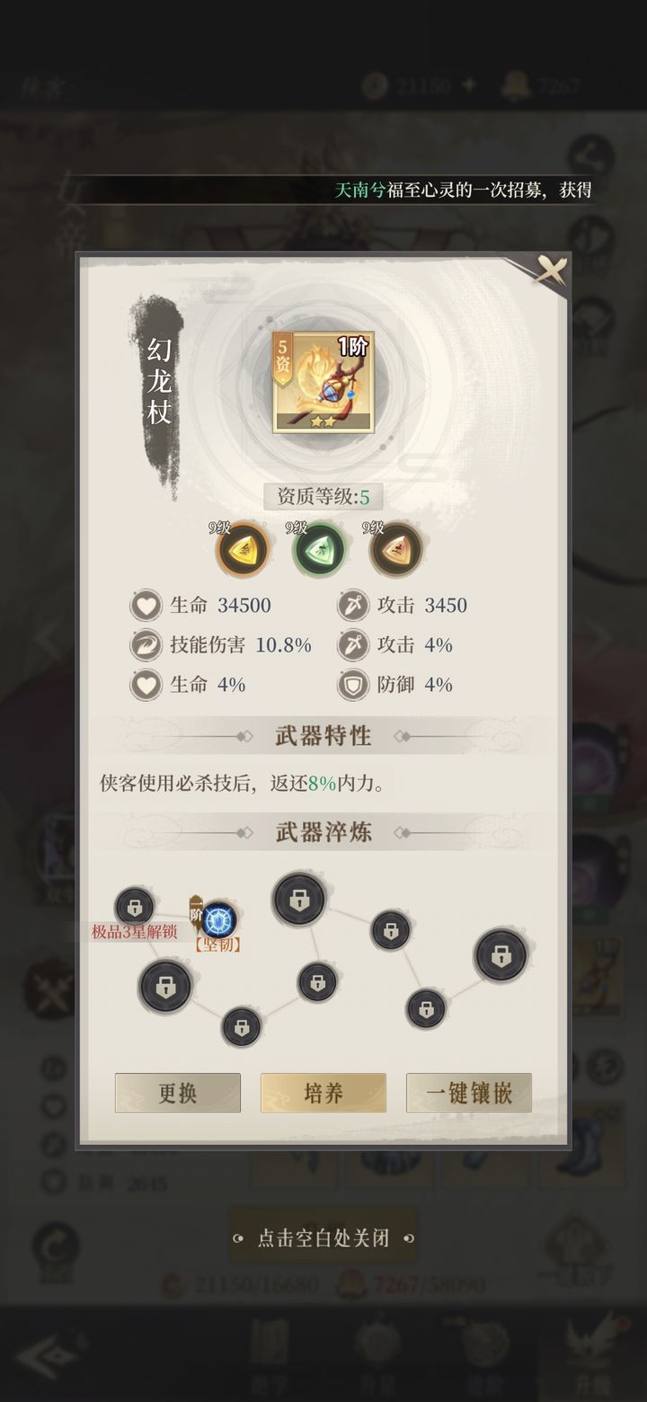 幻龙杖效果:侠客使用必杀技后,返还一部分内力。