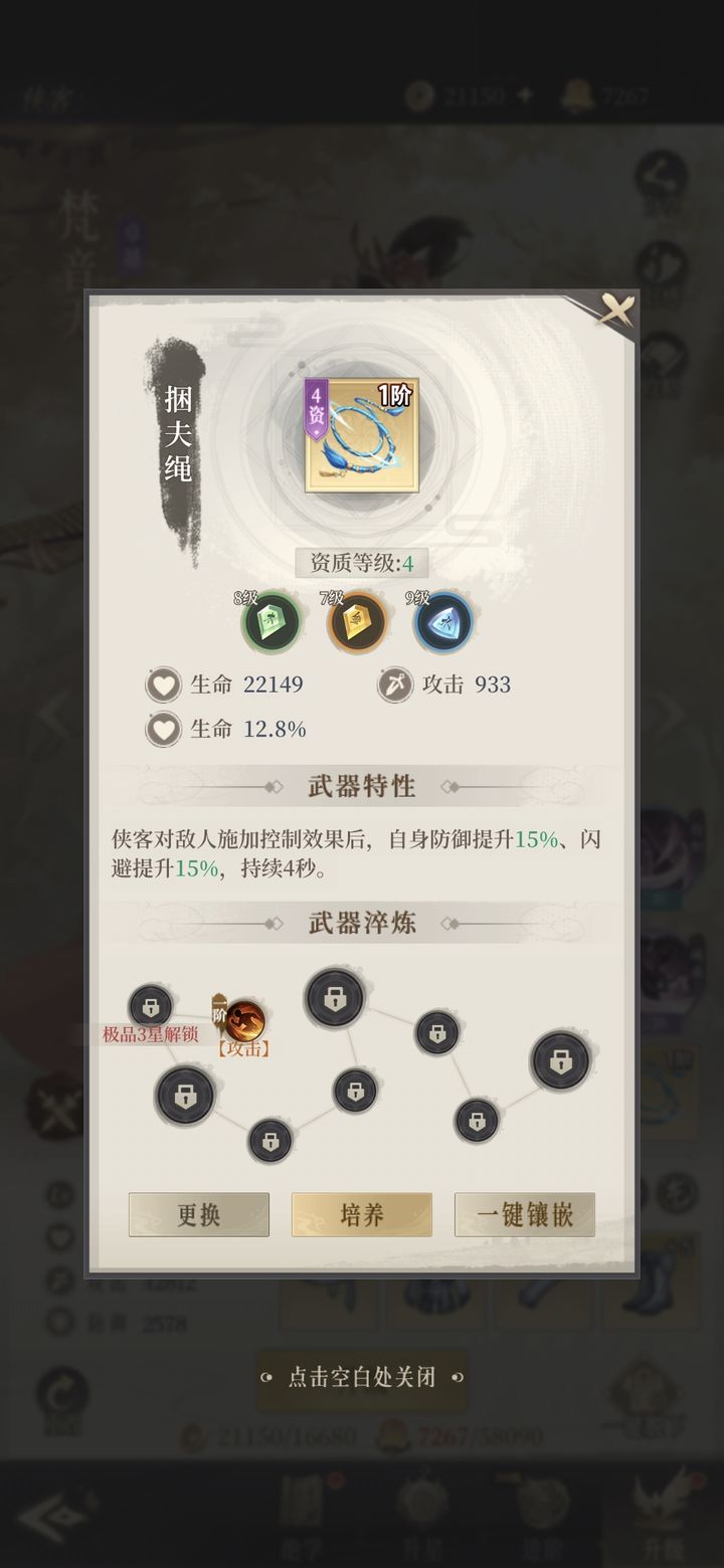 捆夫绳效果:侠客对敌人施加控制效果后,自身防御提升,闪避提升。配合梵音天的必杀:对前方一定区域的敌人造成伤害并眩晕。可以让梵音天的生存能力提高,从而打出更多控制,并且因为其有幻音羁绊,又是远程,所以可以为队友提供治疗及攻击力提升?