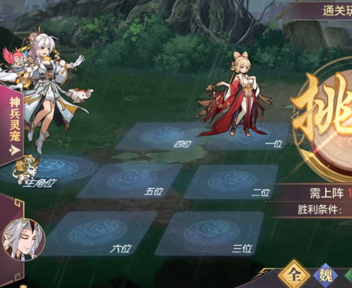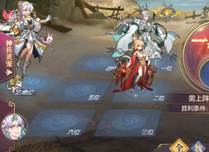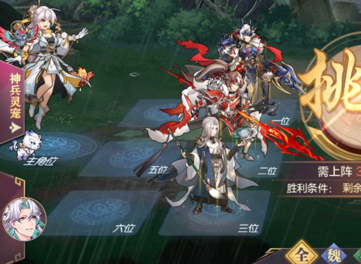 神兵:太凰射日弓、苍天帝剑、乾天玄灵扇,若对面3个在一横排则换为天墟盘龙斧、太凰射日弓、苍天帝剑