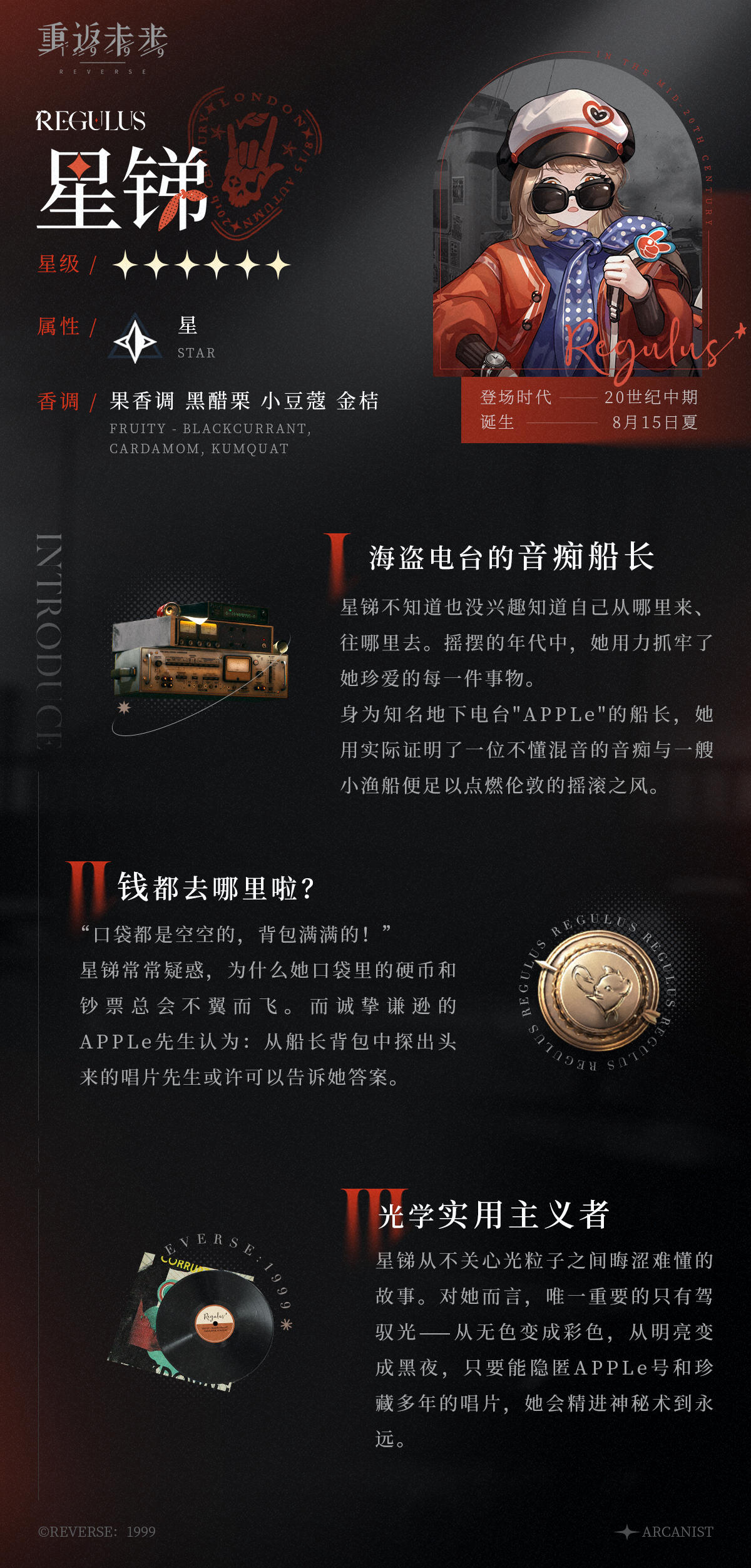 神秘学家 | 星锑吃货酱酱发布于 2023-05-21关注神秘学家星锑 | Regulus“在海上漂流,在电台狂欢,向所有的新玩意发起进攻,直到永远!” 星锑不知道也没兴趣知道自己从哪里来、往哪里去。摇摆的年代中,她用力抓牢了她珍爱的每一件事物。身为知名地下电台"APPLe"的船长,她用实际证明了一位不懂混音的音痴与一艘小渔船便足以点燃伦敦的摇滚之风。