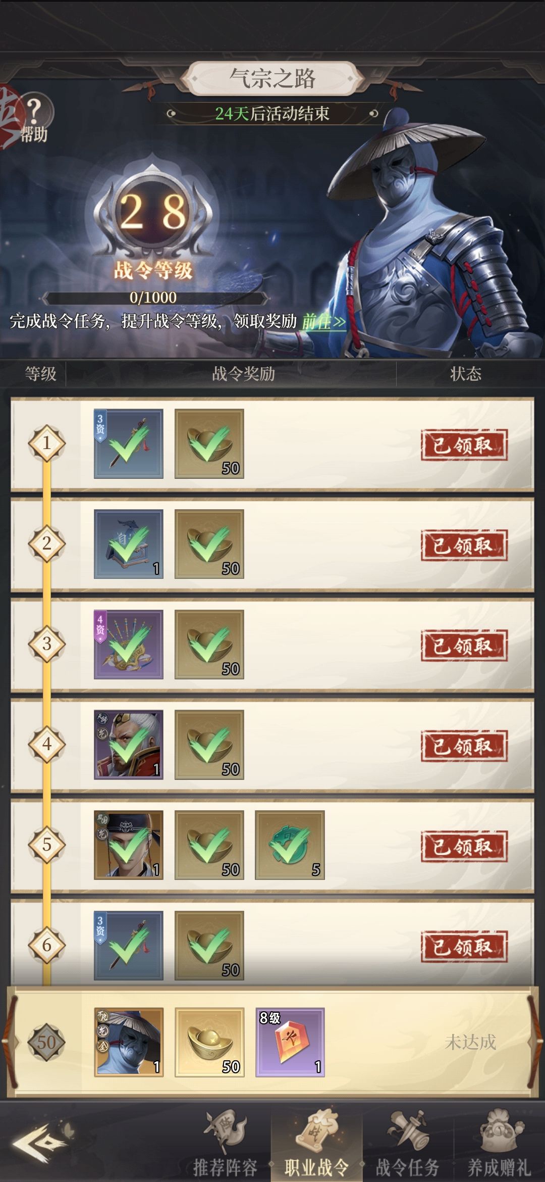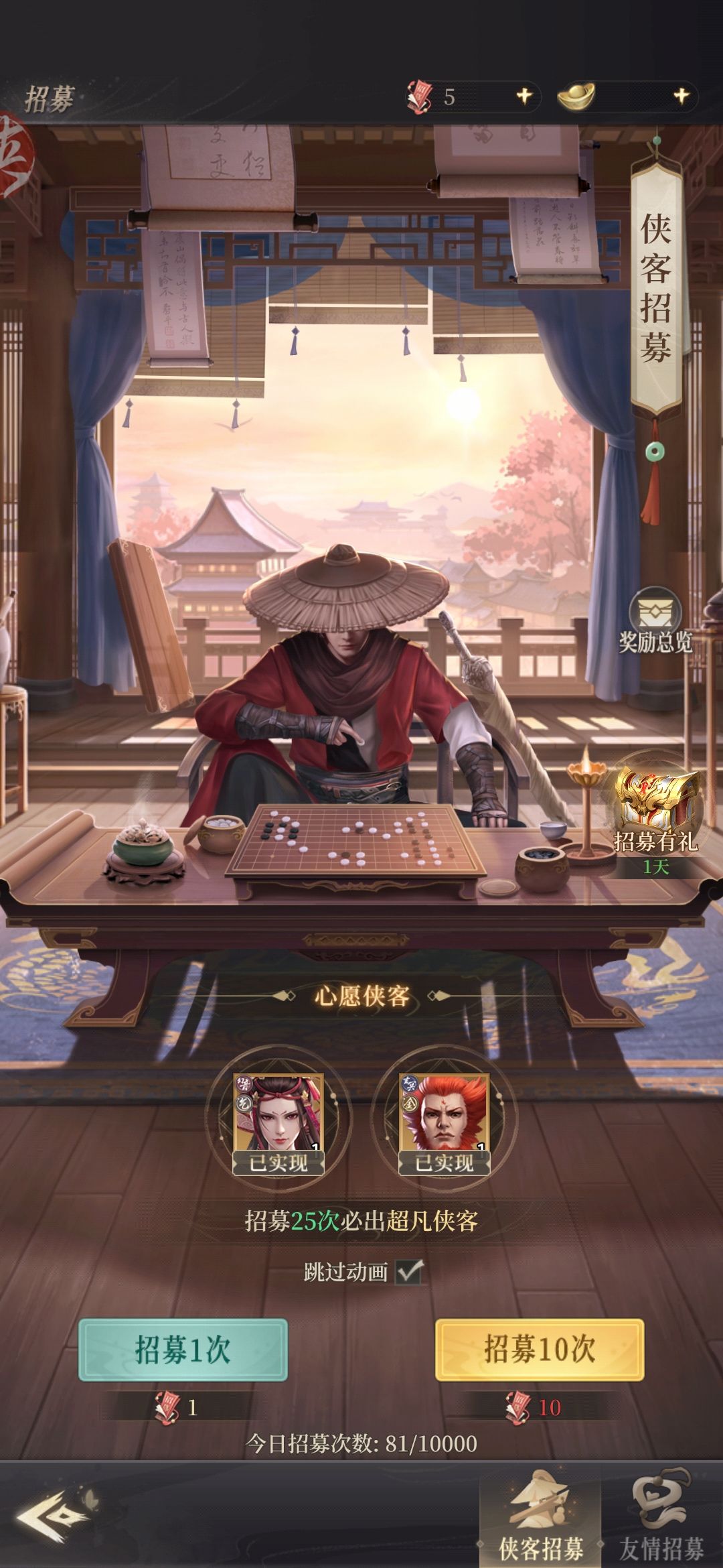 我们过一下强化下队伍方便我们跟好过图体力清完任务过完就抽卡升星白嫖千万别用元宝 没什么好说的就是过图都做完第二天差不多100抽解锁心愿这里就是先都二星然后必选李存礼