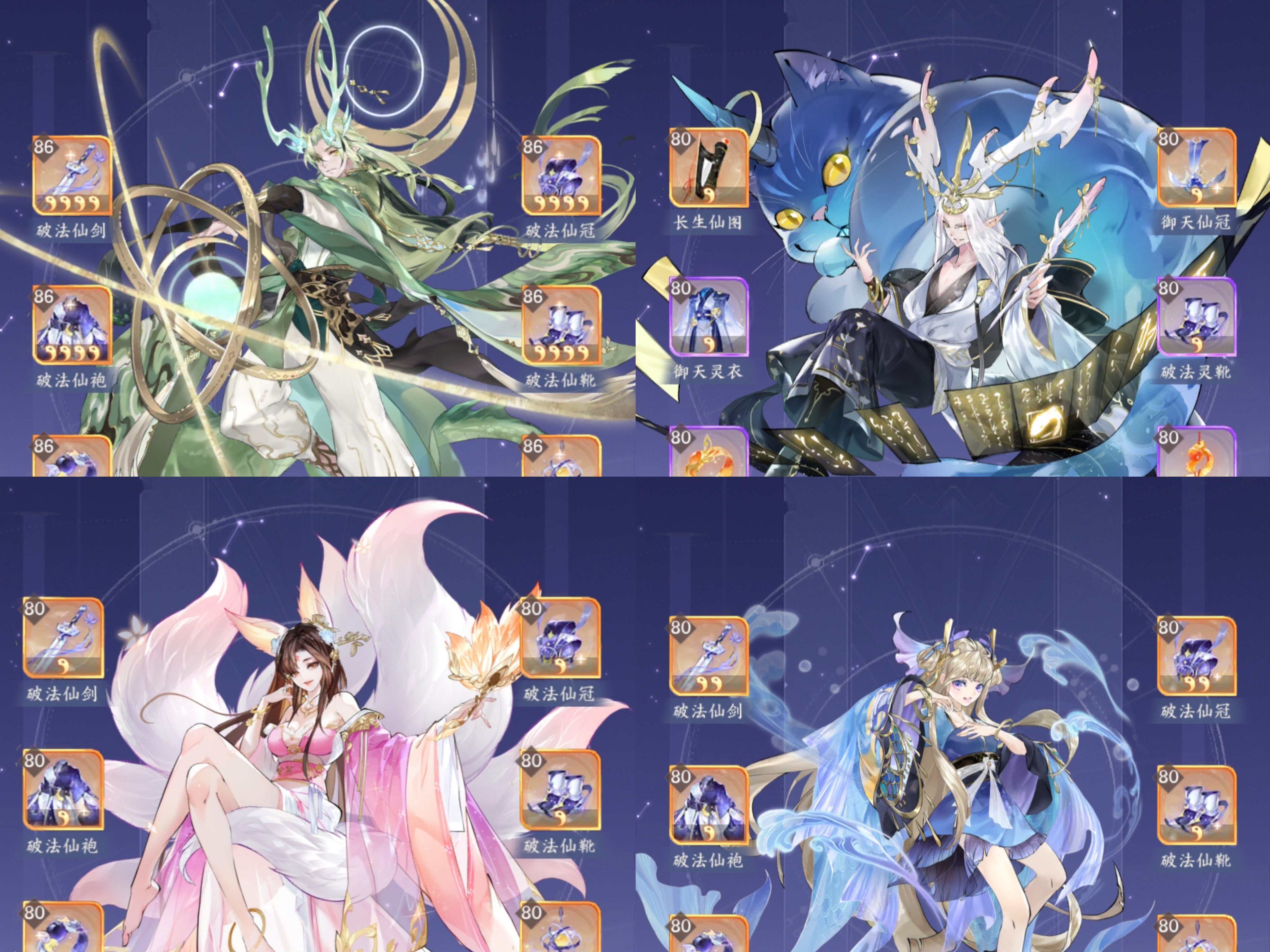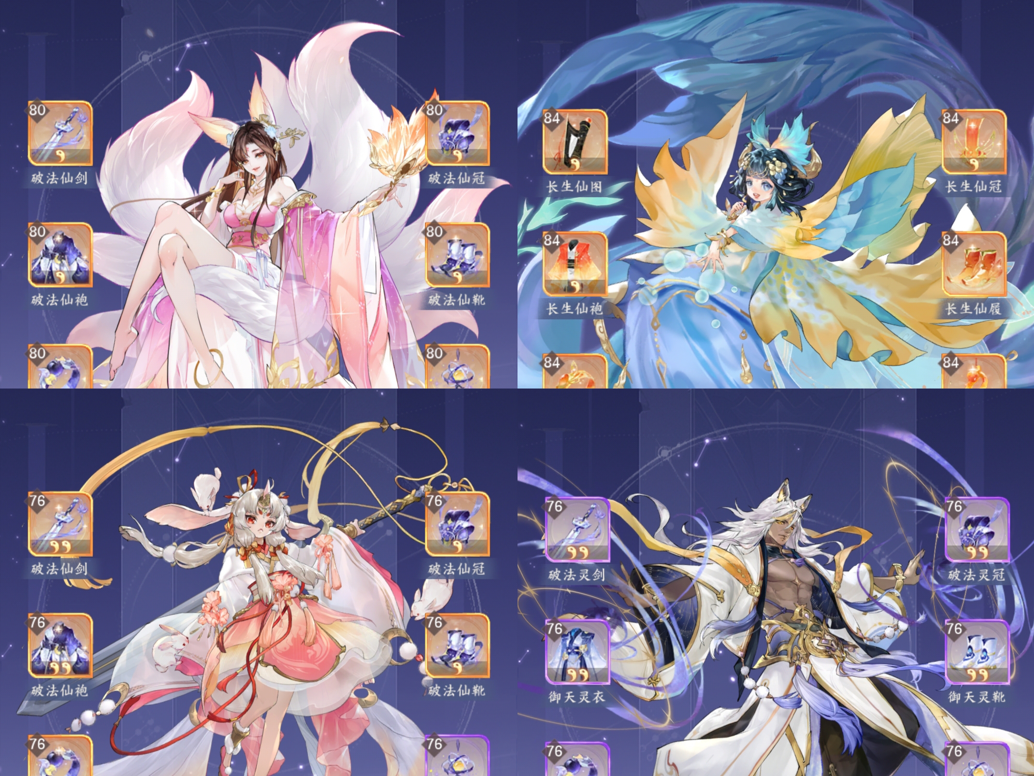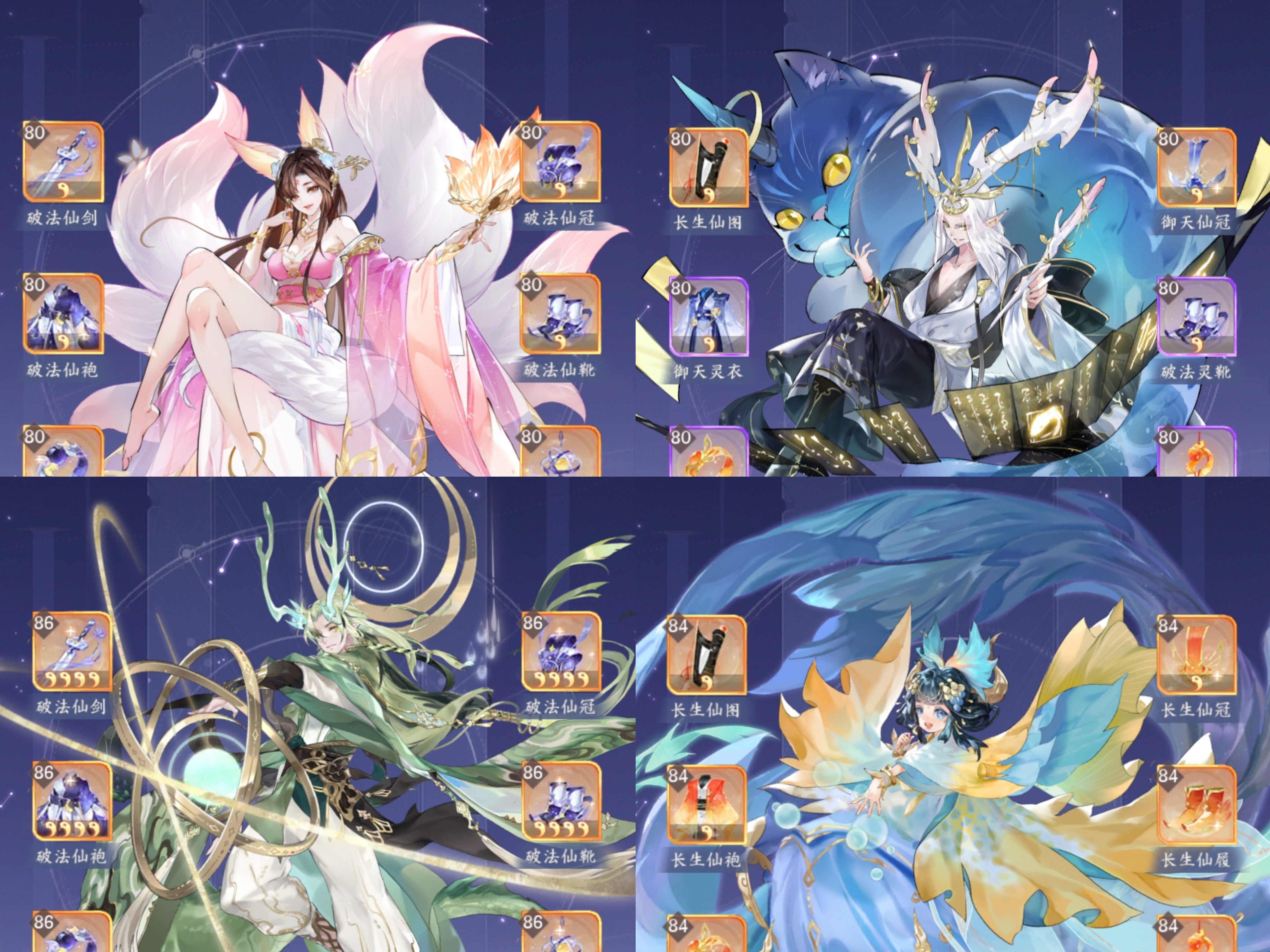 九尾+玄兔+天狗:破法套装。鲲:长生套装。
