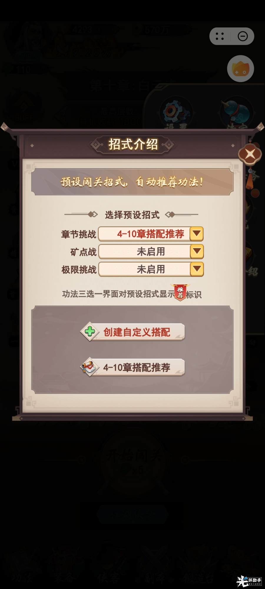 给各位新入坑的小伙伴们一个小tip,如果你不熟悉功法,可以打开屏幕右边的“更多”,打开“招式介绍”,选择系统推荐的搭配,也可以创建自定义搭配功法