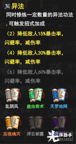 4、4异法,选“忘我魂灭”“天罗地网”“蛊虫奇术”“乱阴风”(四个足矣,不用特地凑6异法),降低敌人30%暴击、闪避、减伤,这个效果对boss蛮有用的