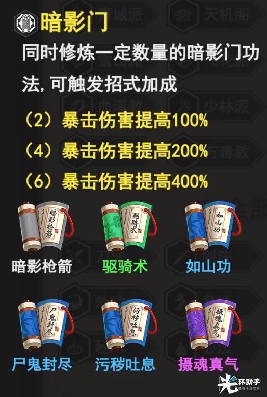 2、6暗影门,提高暴击伤害,这个是必拿的,但是可以先拿齐4-6刀法再开始凑暗影门,简单粗暴